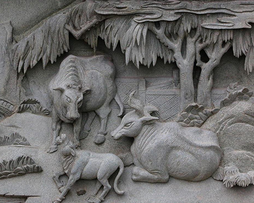 我厂所生产的浮雕便是用青石雕刻制成的,工作人员在一块平板上进行反复雕刻,使它脱离原来材料的平面样子,产生立体效果,靠透视等因素来表现三维空间,并只供一面或面观看。